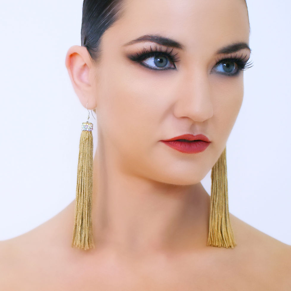 Full of movement and made to dazzle—our rhinestone fringe earrings bring drama and sparkle to every look. The cascading strands catch the light beautifully, making them perfect for stage, competition, or a bold fashion moment.