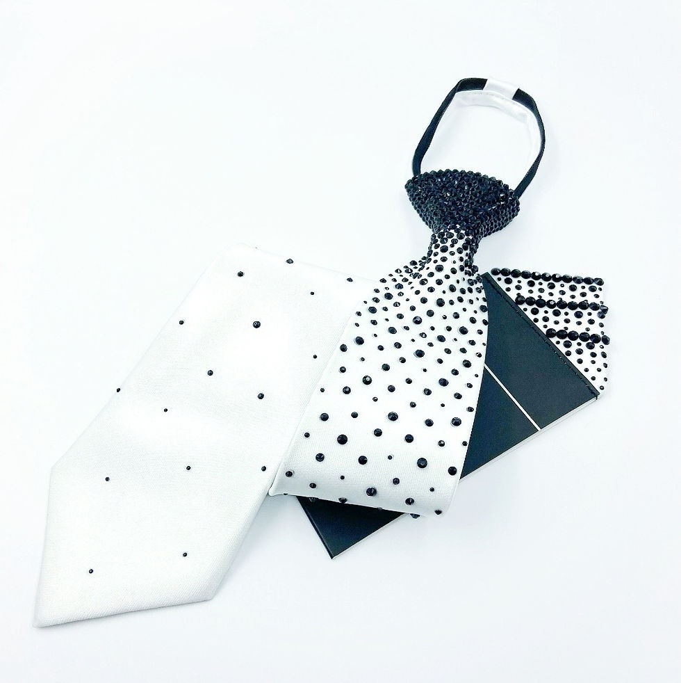 Our matching tie and pocket square sets make it easy to look sharp and coordinated without the guesswork. Each set includes a pre-made rhinestoned neck tie and a perfectly folded pocket square—designed to match and made to shine. With a wide range of colors and finishes, these sets are perfect for performers, special events, or anyone wanting to add some effortless sparkle to their look.