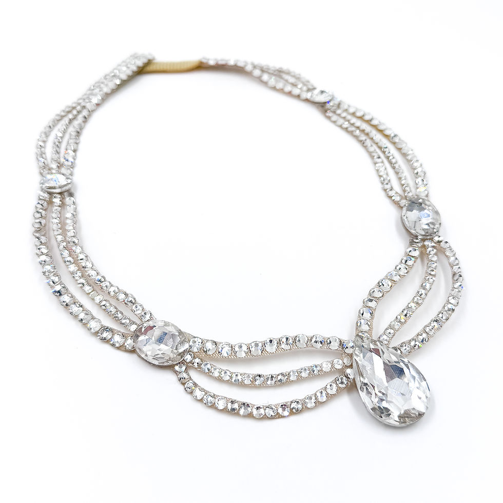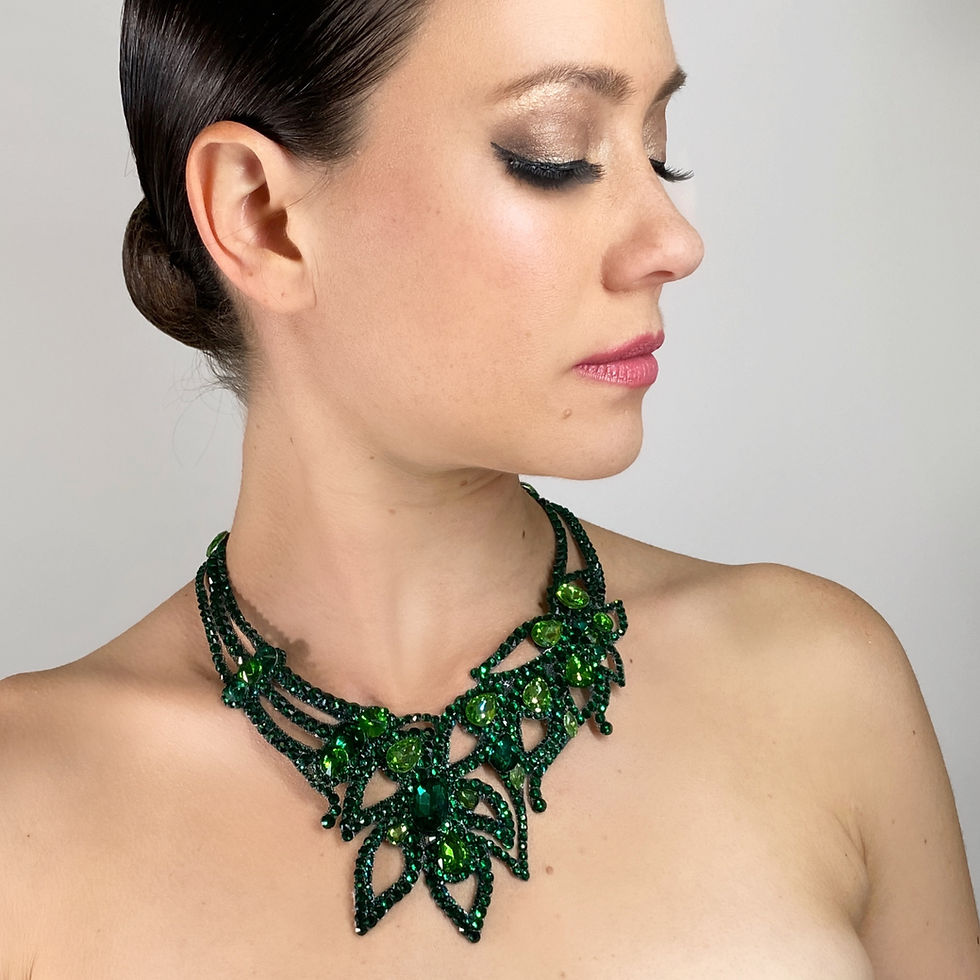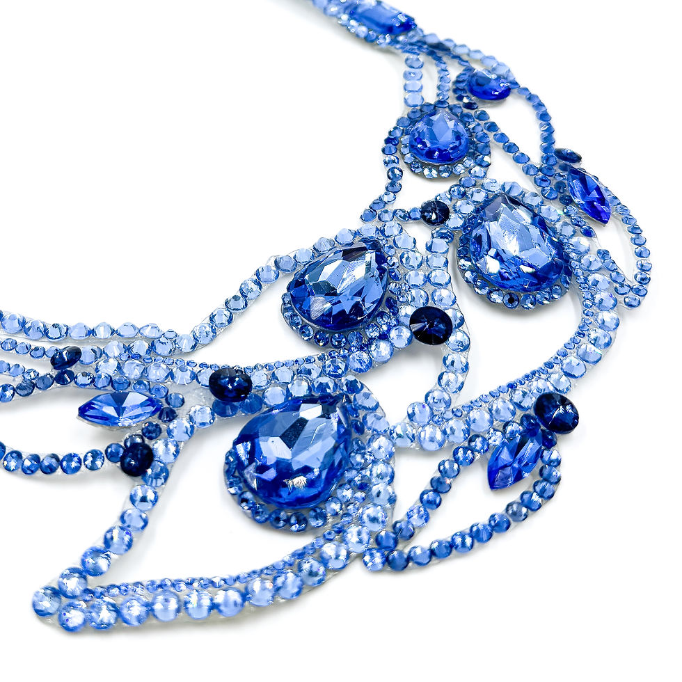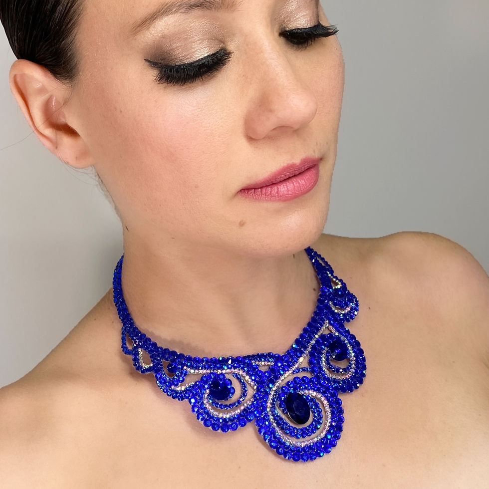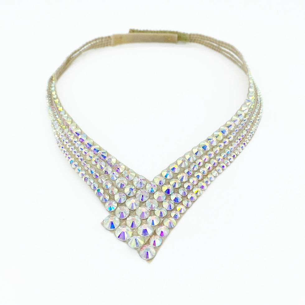 Our rhinestone necklaces are designed with both comfort and performance in mind. Made on a flexible backing, they contour effortlessly to the shape of your neck and stay perfectly in place—no shifting or flying around while you move. Each necklace fastens with a secure Velcro closure and should be stored flat to maintain its shape and sparkle.
